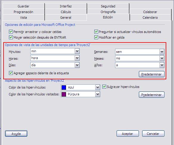 Desde aquí podemos cambiar las etiquetas para los valores de tiempo si es que no nos resultan cómodas las ya definidas por Project.