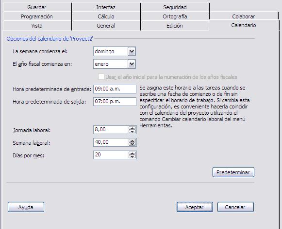Desde esta pestaña podemos configurar las opciones de calendario para el proyecto en que estamos trabajando. Que día comienza la semana, que mes el año fiscal, el horario de entrada y salida de la jornada laboral y el último conjunto de opciones se refiere a la cantidad de hs. laborales por día, cantidad de horas semanales y de días laborales por mes. Estas opciones son las que hay que tener en cuenta en la "redistribución".