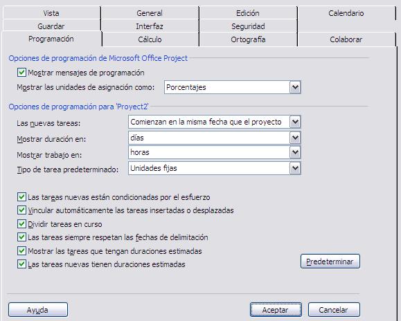 En esta pestaña podemos establecer entre otras cosas, en que formato mostrar las asignaciones de recursos. Que tipo de tarea es el predeterminado, cuando comienzan las nuevas tareas, y en que formato de tiempo las mostraremos y otras opciones de cómo serán las nuevas tareas que ingresemos. La opción Dividir tareas en curso es muy importante que esté tildada si deseamos que cuando redistribuyamos los recursos sobreasignados con la herramienta que nos ofrece Project ésta pueda dividir las tareas necesarias.