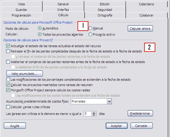 1* Sección Opciones de cálculo para Microsoft Office Project.