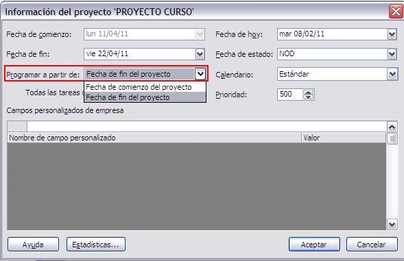 2. En el cuadro de diálogo Información del proyecto, en el recuadro Programar a partir de cambiar por Fecha de fin del proyecto.