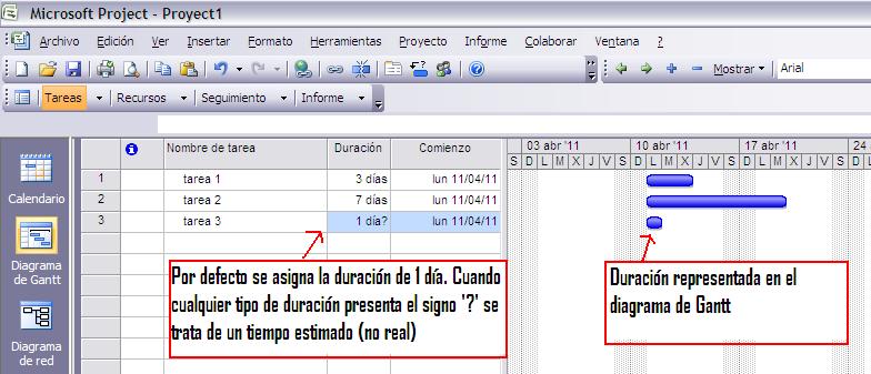 Cuando creamos una tarea, Project asigna a ésta una duración estimada de 1 día, se identifica con un signo de interrogación cerrado. Cuando modificamos ese valor el signo de interrogación desaparece, con ello estamos diciendo que esa duración es de tiempo real, a no ser que agreguemos dicho signo. Esto es de gran ayuda cuando no sabemos bien cuál va a ser la duración de dicha tarea, una vez que confirmemos dicha duración sacamos el signo y listo.