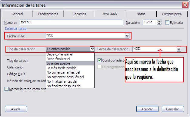 Lo antes posible: Esta es una delimitación flexible, Project programa las fechas de comienzo y de fin límite, de acuerdo a los demás parámetros de programación que hemos definido para las tareas. Este valor es la delimitación predeterminada para las tareas que se programan a partir de la fecha de comienzo del proyecto.