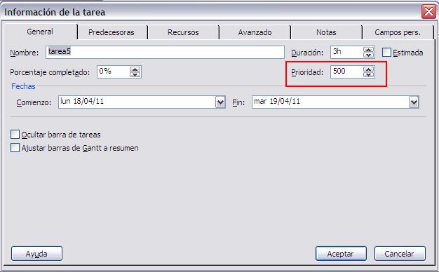 Por defecto todas las tareas tienen una prioridad de 500, o sea que son todas iguales, no es recomendable cambiar esta prioridad si no es estrictamente necesario. Esta función es muy útil para resolver las sobreasignaciones que veremos más adelante.