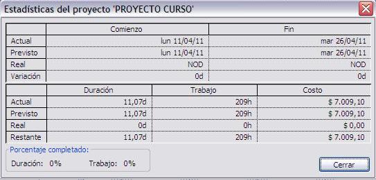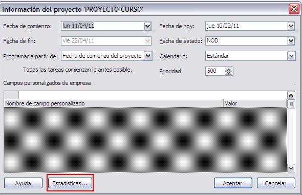 Para ver la información que se guardó en la línea de base y la información real, debemos ir al menú Proyecto → Información del proyecto → hacer clic en el botón Estadisticas.