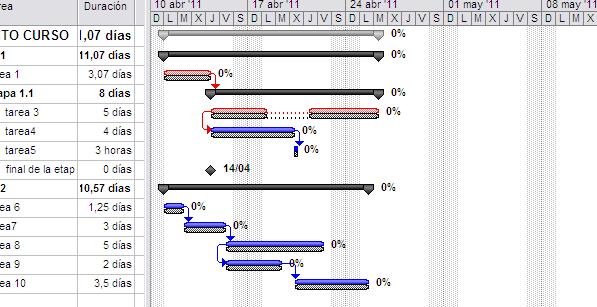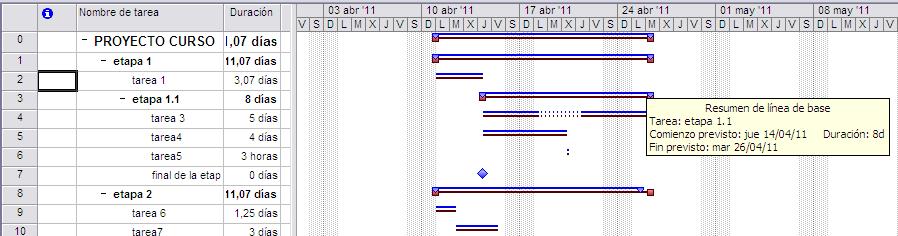 Las barras negras son las líneas de base y las que están sobre ellas son las tareas reales. En la imagen, éstas coinciden por que el proyecto en tiempo real todavía no ha comenzado.