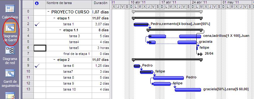Así es como se ve el diagrama de Gantt luego de actualizar el proyecto. Observar que las tareas que ya han comenzado tienen una barra negra dentro que indica el progreso de las mismas.