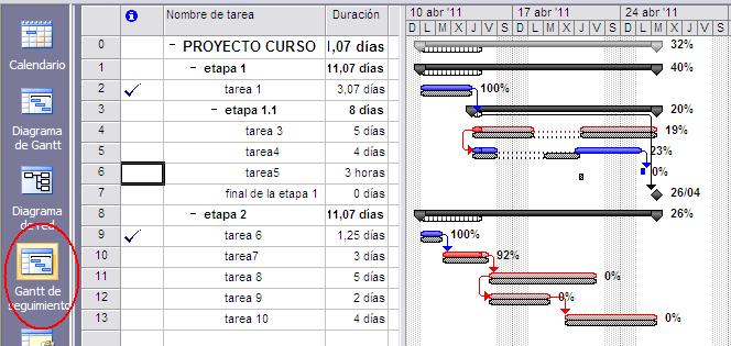 El Gantt de de seguimiento nos muestra el progreso de las tareas siempre con las barras de la línea de base por debajo. Al final de cada barra nos muestra el porcentaje completado. Observar que las tareas que ya están completas tienen un tilde en la columna de Indicadores.