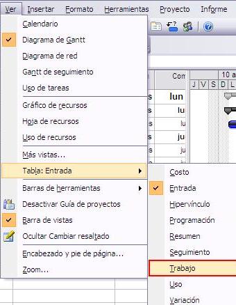 Para introducir el porcentaje completado del trabajo de una tarea, debemos abrir la tabla Trabajo en la vista Diagrama de Gantt.