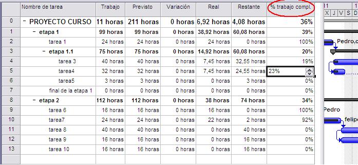 En la columna % de trabajo compl. introducir el porcentaje.