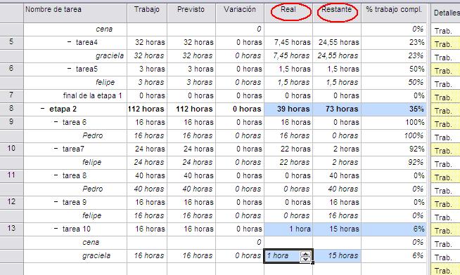 En la columna Real introducir la cantidad de horas reales que ha completado el recurso en esa tarea. Si lo que deseamos es introducir el valor restante lo haremos en la columna Restante.