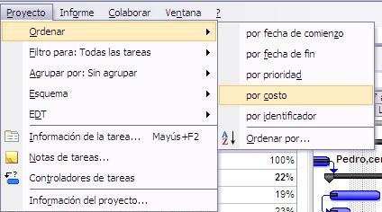 Esta función nos permite ver todos los datos de la vista en que estemos pero ordenados según un criterio. Para ello desde el menú Proyecto → Ordenar se mostrarán criterios para el orden de los datos. El orden por defecto es Por identificador.