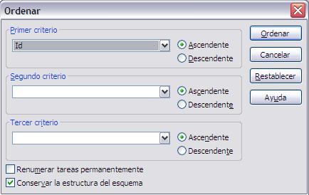 Por medio de este cuadro de diálogo podemos seleccionar hasta tres niveles de orden, decidir si la lista la queremos en orden ascendente o descendente e indicar si los datos se deben volver a enumerar según el nuevo orden que estemos definiendo.