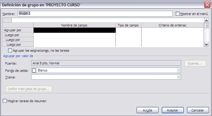 La opción Personalizar Agrupar por:… nos permite revisar o modificar un grupo existente, crear un grupo nuevo, crear grupos dentro de grupos y elegir el color, el tipo de fuente y la trama de los grupos.