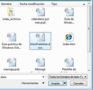 12° En el cuadro de diálogo elige un archivo de texto que tengas, por ejemplo, se está utilizando un archivo llamado IntroPublisher.docx que lo puedes descargar desde Aulaclic. Clic en Aceptar.