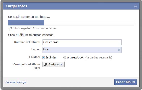 5° En el cuadro de diálogo Cargar fotos, espere mientras se va cargando los archivos a su Facebook. Mientras tanto puede ir agregando un nombre de álbum, un lugar y la calidad.