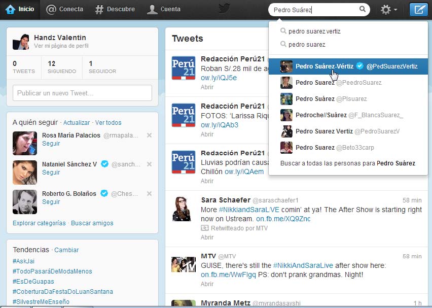 Haga clic en el enlace A quien seguir, y luego en el cuadro Buscar escriba el nombre de la persona que quiere seguir. En la siguiente imagen se muestra el nombre de Pedro Suárez Vértiz