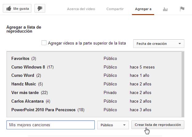 Para tener ordenado su lista de reproducción usted puede crear una nueva lista de reproducción con sus vídeos favoritos.