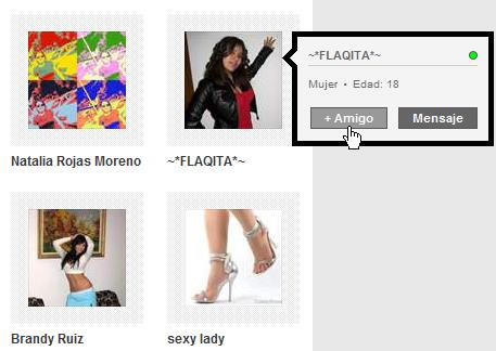 Si lo desea, al señalar la fotografía de perfil de una persona encontrada en MySpace, puede hacer clic en Mensaje, y enviarle un mensaje personalizado a su nueva(o) posible amiga(o).