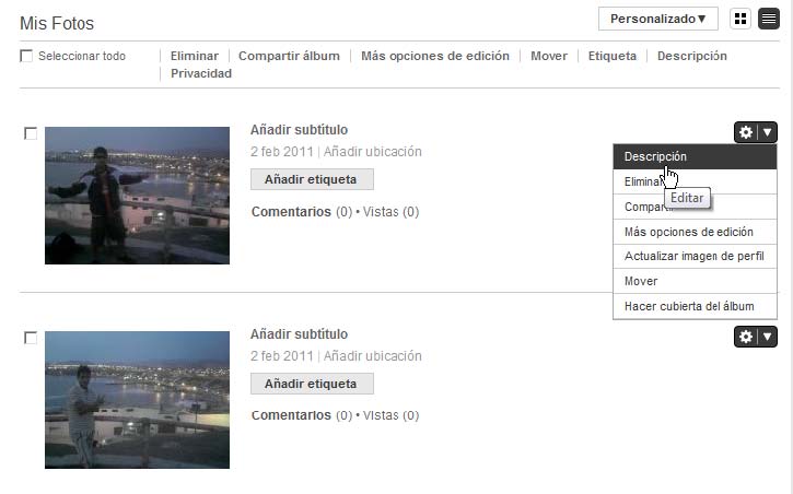 Puede agregar comentarios a las fotos, así como añadir subtítulos y agregar etiquetas. A la derecha de la imagen en miniatura, en encontrará el botón de opciones tal como lo muestra la siguiente imagen: