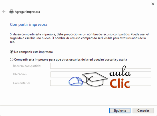 6. Después seleccionamos si deseamos compartir la impresora o no. En nuestro caso diremos que no, toda vez que se trata de una impresora en red. Al pulsar Siguiente la impresora se añade a la lista de impresoras instaladas.