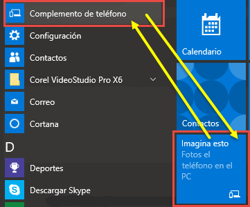 Podemos encontrar Complemento del teléfono anclado en el menú Inicio, pero si no es así, se encuentra por supuesto en la lista de aplicaciones, en la letra que le corresponde.