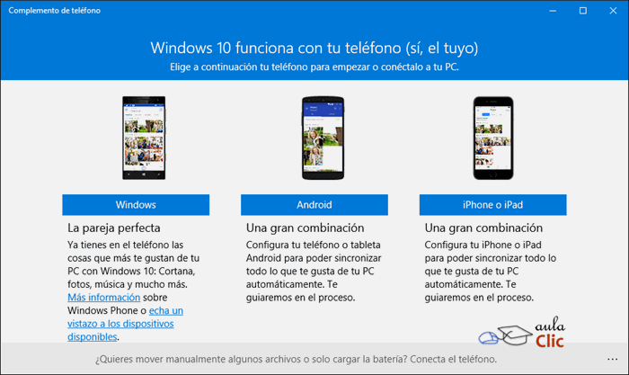 Al abrirlo, debemos seleccionar el tipo de smartphone que vamos a conectar y sincronizar con Windows 10, por lo que vemos la siguiente pantalla.