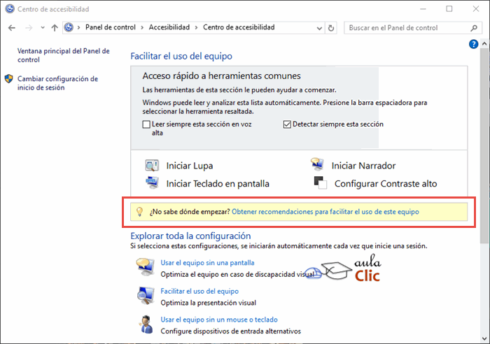 En la ventana del Panel de control, ya sea en la vista de Categorías o en la de iconos, debemos pulsar en el Centro de Accesibilidad. Al abrirse, comienza a funcionar parcialmente el Narrador para asistir su uso. En dicha ventana debemos hacer clic en Obtener recomendaciones para facilitar el uso de este equipo.