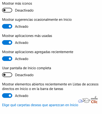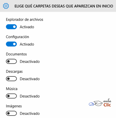 La liga de la parte inferior, como lo indica el texto Elige qué carpetas deseas que aparezcan en Inicio, permite elegir las carpetas que aparecen en el menú Inicio. De modo predeterminado, los elementos de menú activos son Configuración y el Explorador de archivos, pero podemos añadir ahí varios más, como Documentos, Descargas, Imágenes, etcétera. Al pulsar en esta opción, se abre por supuesto la lista de la que podemos seleccionar.