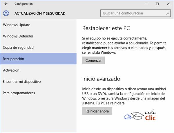 Las opciones del apartado anterior nos permiten recuperar nuestros archivos de datos ante cualquier fallo del ordenador, pero no nos permiten restaurar Windows en caso de algún fallo general. Para eso sirven las opciones de la categoría siguiente, Recuperación. Cuando Windows 10 se instala, deja en el ordenador una partición oculta en el disco duro con los archivos necesarios para reinstalar el sistema en caso necesario, esta partición recibe el nombre de Entorno de recuperación de Windows. También podemos recurrir a esta opción si deseamos eliminar todos los datos y aplicaciones instaladas y devolver nuestro ordenador al estado que guardaba al comprarlo. En cualquier caso, por el alcance de estas opciones, deben usarse con cuidado.