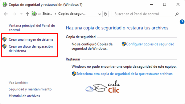 Sin embargo, aunque Windows 10 se reinstale, en ambos casos las aplicaciones instaladas se pierden, lo cual también puede hacernos perder tiempo y dinero. La alternativa es crear una imagen de las unidades de disco de nuestro ordenador en un disco duro externo, o bien en un juego de DVD's. Para ello debemos ir al menú Inicio > Todas las aplicaciones > Sistema de Windows > Panel de Control > Sistema y seguridad y en dicha categoría, seleccionamos Copias de seguridad y restauración (Windows 7). Abrirá la siguiente ventana, las opciones que nos interesan están en el panel de la izquierda: Crear una imagen de sistema y Crear un disco de reparación del sistema.