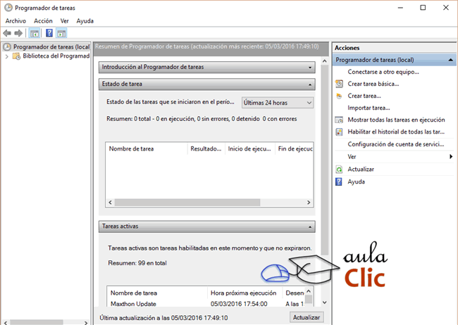 Podemos ver un listado de las tareas que hemos ido creando en el equipo, así como las que se crean automáticamente por el sistema, desde el apartado Tareas activas de la zona central.