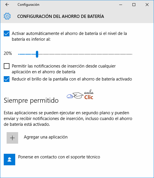 Siempre permitido. Estas aplicaciones se pueden ejecutar en segundo plano y pueden enviar y recibir notificaciones de inserción, incluso cuando el ahorro de batería esté activado. De manera predeterminada, las aplicaciones que funcionan en segundo plano se desactivan con el ahorro de batería. En esta opción podemos indicar algunas excepciones. De manera predeterminada, la única excepción es la que permite ponerse en contacto con el soporte técnico de Microsoft.