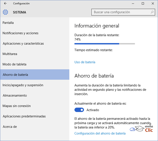 Cuando seleccionamos la opción Configuración del ahorro de batería, se abre una nueva ventana indicando lo que debe ocurrir cuando el nivel de energía es bajo. Sus opciones son: