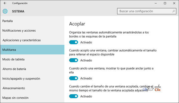 En la parte superior izquierda de la ventana, tenemos siempre una flecha que nos devuelve a la pantalla principal de Configuración. Luego vemos el título de la categoría en la que nos encontramos. El panel a la izquierda muestra los diversos temas a configurar en esta categoría (en la imagen anterior, Multitarea está resaltado). A la derecha, los parámetros correspondientes al tema. Si regresamos a la ventana principal y seleccionamos otro icono, por ejemplo Personalización, veremos que la estructura es la misma: Panel con temas a la izquierda, parámetros a configurar a la derecha.