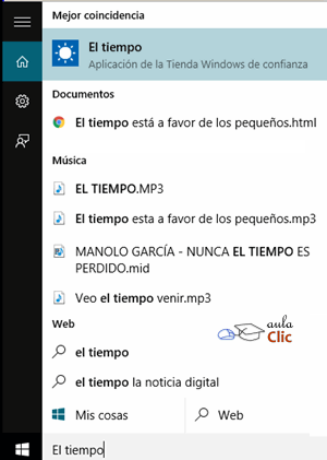 Pongamos un ejemplo de esta dualidad con una búsqueda que se preste a ambas circunstancias. Si escribimos "El tiempo" en la caja de búsqueda, aparecerá como resultado tanto la aplicación que muestra el clima en nuestro ordenador, como archivos que contengan esas palabras en su nombre, así como sitios de Internet relacionados.