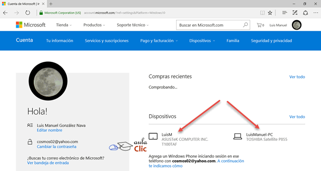 Como podemos ver, en cualquier momento es posible volver a una cuenta local, cerrando este inicio de sesión con la opción Iniciar sesión con una cuenta local en su lugar. También tenemos disponible una opción llamada Administrar mi cuenta de Microsoft, que nos lleva a una página web en donde podremos realizar algunos cambios, pero también ver qué otros dispositivos tengo asociados a esa cuenta. En la imagen siguiente puede verse que, hasta ahora, son dos dispositivos en los que he iniciado sesión con la misma cuenta de Microsoft.