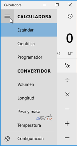 El menú para seleccionar otras funciones se despliega con el icono que está a la izquierda de la palabra ESTÁNDAR. Dicho menú tiene básicamente dos secciones. En la primera podemos elegir entre diversos tipos de calculadoras: Estándar, Científica y Programador. En tanto que la siguiente sección convierte a la calculadora en un convertidor de valores. El tipo de conversión a efectuar debe seleccionarse en la lista: Volumen, Longitud, Peso y masa, Temperatura, Energía, Área, Velocidad, Tiempo, Potencia, Datos, Presión y Ángulo.