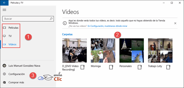 La interfaz de Películas y TV es muy similar a la de Fotos y Groove Música. Recopila los archivos de video de nuestro ordenador y los presenta por carpetas. Propone tres grupos de videos en su interfaz: Películas, TV y Videos.