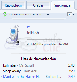 Al pulsar el menú Sincronizar, en el panel de la derecha aparece la Lista de sincronización. Su manejo es igual que la lista de reproducción o la de grabación.