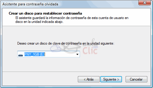 A través de la opción Crear un disco para restablecer contraseña crearemos un disquete o una memoria flash capaz de iniciar sesión en el equipo. El motivo por el que se crea en un disco, es porque a la hora de usarlo se supone que no habremos accedido al sistema, por lo que no podremos buscar en el disco duro. Pero sí nos permitirá buscar en los medios extraíbles. Al pulsar la opción se inicia un asistente: La primera ventana sólo nos da la bienvenida y nos informa del propósito de crear el disco.