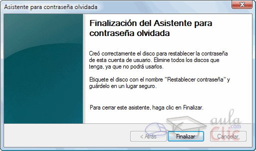 Con esto habremos llegado al final del asistente. Ahora en el disco tenemos el archivo userkey.psw. Este es el archivo que restablece la contraseña. Realmente no tenemos por qué guardarlo en el disco. Podemos copiarlo a otro equipo al que tengamos acceso, o en un servidor de correo electrónico. Lo que debe quedarnos claro, es que cualquier usuario podrá entrar a nuestra cuenta con este archivo. Podrá crear una nueva contraseña, y si realiza otra vez el proceso de crear el disco, sólo será válido el archivo userkey.psw más actual, lo que impedirá que podamos acceder a nuestra cuenta. |
