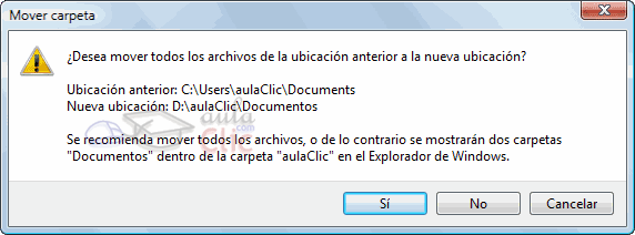 Pulando en Sí, se copiarán los archivos de la carpeta a su nueva ubicación. Pulsando en No, los documentos permanecerán en la antigua ubicación. |