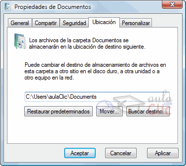 Al instalar Windows Vista, en la misma unidad, se crea una carpeta llamada Usuario (Users) destinada a contener los documentos de los usuarios. Dentro de esta carpeta, se crea una carpeta para cada usuario del equipo, dentro de la cual se crean sus carpetas personales (de color verde). Podemos cambiar la ubicación de estas carpetas. Por ejemplo, podemos ubicarlas en otra partición del disco distinta a la del sistema. Esto hará que no perdamos nuestros documentos si por ejemplo, nos vemos obligados a formatear el sistema. Aunque cambiemos la carpeta de ubicación, esto será transparente a la hora de navegar usando el Explorador de Windows. Es decir, cuando pulsemos sobre nuestra carpeta de usuario, aparecerán como subcarpetas todas las carpetas personales, aunque estén en ubicaciones distintas. Para cambiar la ubicación debemos hacer clic derecho sobre la carpeta y abrir sus Propiedades desde el menú contextual. En la ventana Propiedades, hay que seleccionar la pestaña Ubicación.
