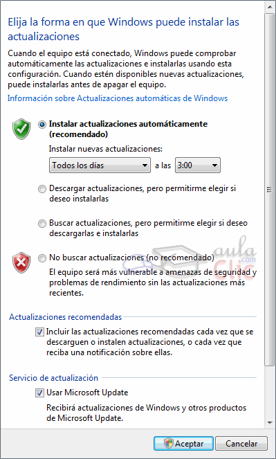 · La primera opción, Instalar actualizaciones automáticamente, busca las actualizaciones y las instala en el periodo que indiquemos en los desplegables. Aparecerá un icono en el área de notificación cuando se instalen las actualizaciones. · La opción Descargar actualizaciones, pero permitirme elegir si deseo instalarlas, busca y decarga las actualizaciones. Cuando están descargadas nos avisa para que decidamos si instalarlas o no. · La tercera opción, Buscar actualizaciones, pero permitirme elegir si descargarlas e instalarlas, simplemente nos avisa cuando están disponibles, para que inciemos la descarga e instalación. · No buscar actualizaciones evita que Windows Update las busque. Si elegimos esta opción, deberemos buscarla de forma manual cada cierto tiempo.