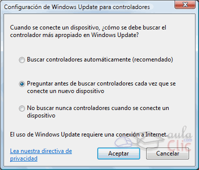 Buscar controladores automáticamente, hace que Windows busque directamente a través de Windows Update. Preguntar antes de buscar controladores cada vez que se conecte un nuevo dispositivo. Nos preguntará antes de iniciar la búsqueda. No buscar nunca controladores cuando se conecte un dispositivo. Evita el uso de Windows Update para actualizar el dispositivo.