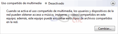 Esta opción permite que nuestro contenido multimedia (música, imágenes y vídeo) compartido sea accesible por los usuarios de la red, y a su vez nosotros podamos acceder al contenido multimedia compartido en la red. Pulsando Cambiar... accedemos a otra ventana, donde podemos marcar o desmarcar la opción Compartir mi multimedia. |