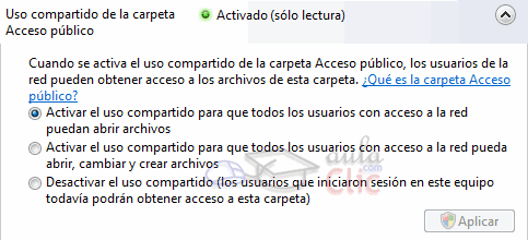 La carpeta de Acceso público tiene un comportamiento especial, que hace que pueda estar compartida, aunque tengamos desactivado el Uso compartido de archivos. Podemos elegir tres opciones: · La primera, permite a los usuarios acceder a la carpeta, pero sólo leer los archivos, sin modificarlos. · La segunda, permite a los usuarios de la red acceder a la carpeta, pero además cambiar los archivos y crear archivos nuevos. · La tercera opción desactiva el uso compartido aunque los archivos estén compartidos. No obstante, si ya hay usuarios a la carpeta, estos podrán seguir haciéndolo durante esta sesión.