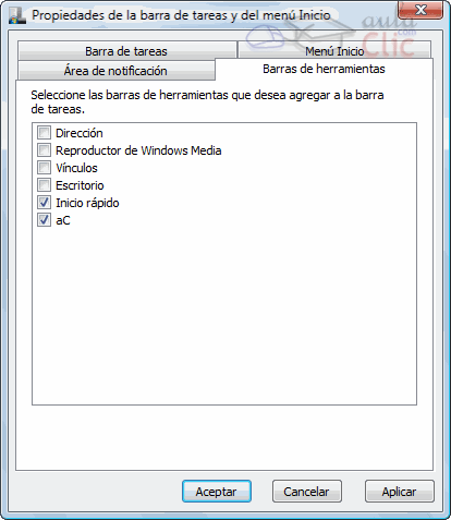 Aquí podemos activar o desactivar las distintas barras de herramientas. En la imagen vemos la barra aC, que es una barra personal que hemos creado con los accesos que nos interesan.