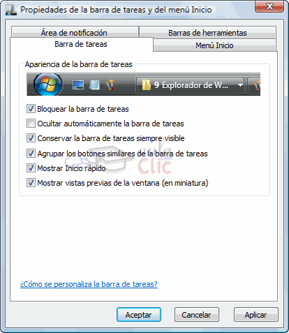 Podemos activar o desactivar las siguiente opciones de la barra de tareas: · Bloquear barra de tareas. Igual que si lo hacemos del menú contextual, cuando está desbloqueada, podemos modificar su tamaño. · Al marcar Ocultar automáticamente la barra de tareas, esta no se visualiza todo el tiempo, y para verla debemos desplazar el puntero del ratón hasta la parte inferior de la pantalla. · Conservar la barra de tareas siempre visible hace que nada pueda estar "encima" de ella ocultándola. · Agrupar los botones similares, hace que si por ejemplo hay abiertas 9 ventanas del explorador se muestren como en la imagen, en vez de en nueve botones. · Mostrar inicio rápido, si se desactiva, se ocultan los iconos de inicio rápido junto al botón Inicio. · Si desactivamos Mostrar vistas previas de la ventana (en miniatura) al dejar el cursor sobre el botón de una ventana de la barra de tareas, no se mostrará su miniatura.